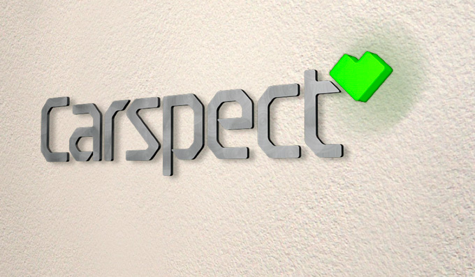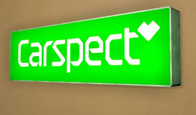 ”Carspect” stansas här i metall, medan logotypens hjärtsymbol i grönt utformas som en egen ljuslåda med inbyggd belysning. Bakbelysta bokstäver alternativt riktad belysning framifrån nattetid.