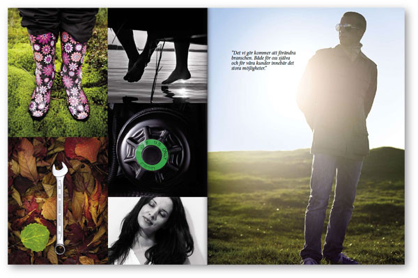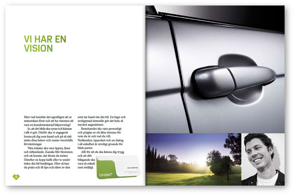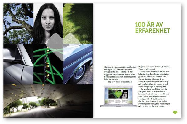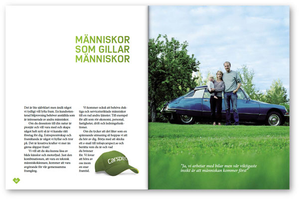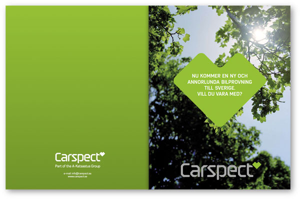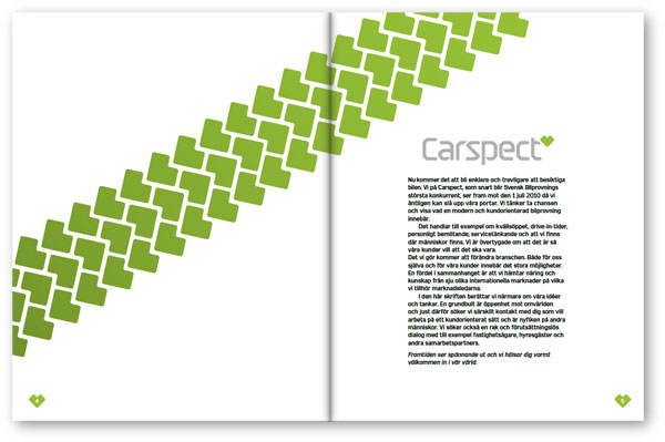 Nedan är ett antal uppslag från Carspects broschyr att inspireras av vid produktion av nytt material. Här visas hur man kan använda färger, illustrationer, typografi och bilder på ett bra sätt. Broschyren finns även för nedladdning i pdf-format här.